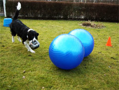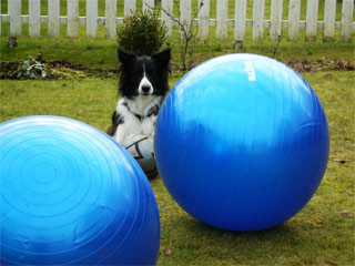 Tänk på att hunden ALDRIG får leka med bollarna på egen hand oavsett om du använder dig av yogaboll, basketboll eller någon annan typ av boll. Biter hunden i bollen är det bara att börja om. Ta bort hunden och gör något annat och sedan försöker ni lugnt igen. Kanske får ni ta myrsteg helt enkelt och träna i små små steg där steg ett kanske är att hunden skall kunna ligga bredvid bollen avslappnat och titta på dig utan att röra bollen.